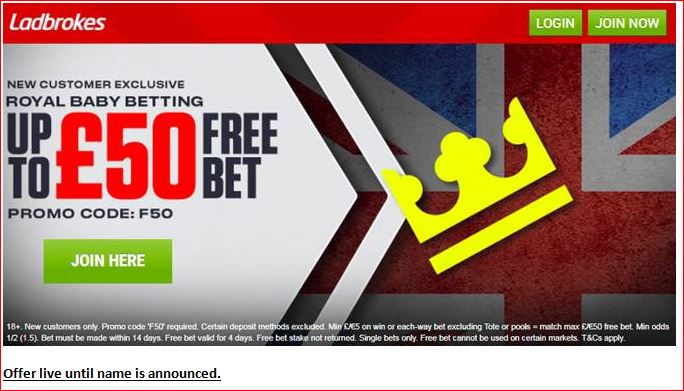 Get a matched bet from between £5 to £50 if you join Ladbrokes and place a bet on the name of the new baby boy.