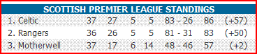 Both sides have to complete the season with away games, but Celtic are in the box seat with a 3-point advantage and a superior goal difference.