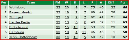Hertha Berlin drew 0-0 at home to Schalke to end their title aspirations as they are three points behind Wolfsburg and only a +11 goal difference - 24 goals less than Wolfsburg.